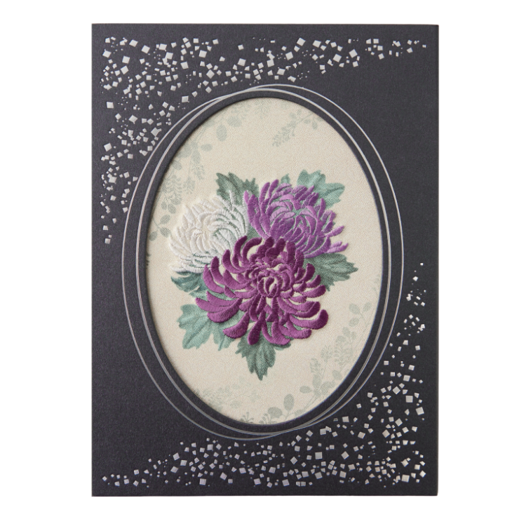 落ち着いたグレーの表紙に銀色の箔押しを散りばめ、大きな3輪の菊を刺しゅうであしらった上品な電報台紙です。