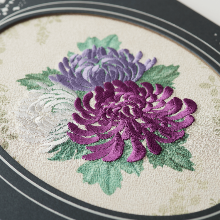 背景に葉をデザインし、菊の刺しゅうには3色の糸を使用することで、立体感を表現しました。