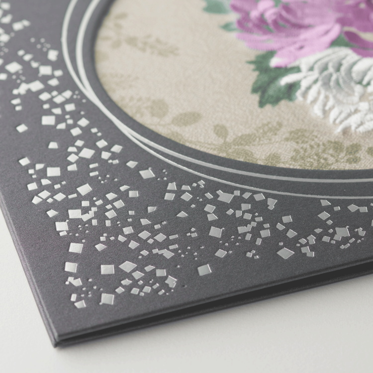 落ち着いたグレーの表紙に銀色の箔押しを散りばめ、大きな3輪の菊を刺しゅうであしらった上品な電報台紙です。