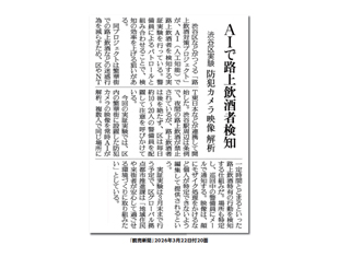2026年3月22日 朝刊20面 AIで路上飲酒者検知 渋谷区実験 防犯カメラ映像解析 -