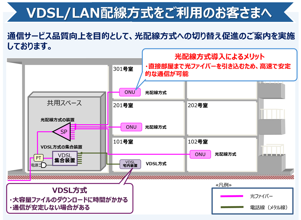 - 東日本エリアで、VDSL/LAN配線方式でご提供中のサービス(フレッツ光ネクストマンションタイプ、ひかり電話ネクスト)提供中のサービス(フレッツ光ネクスト マンションタイプ、ひかり電話ネクスト)のための集合装置を導入している建物のオーナー様、および管理会社様の一部