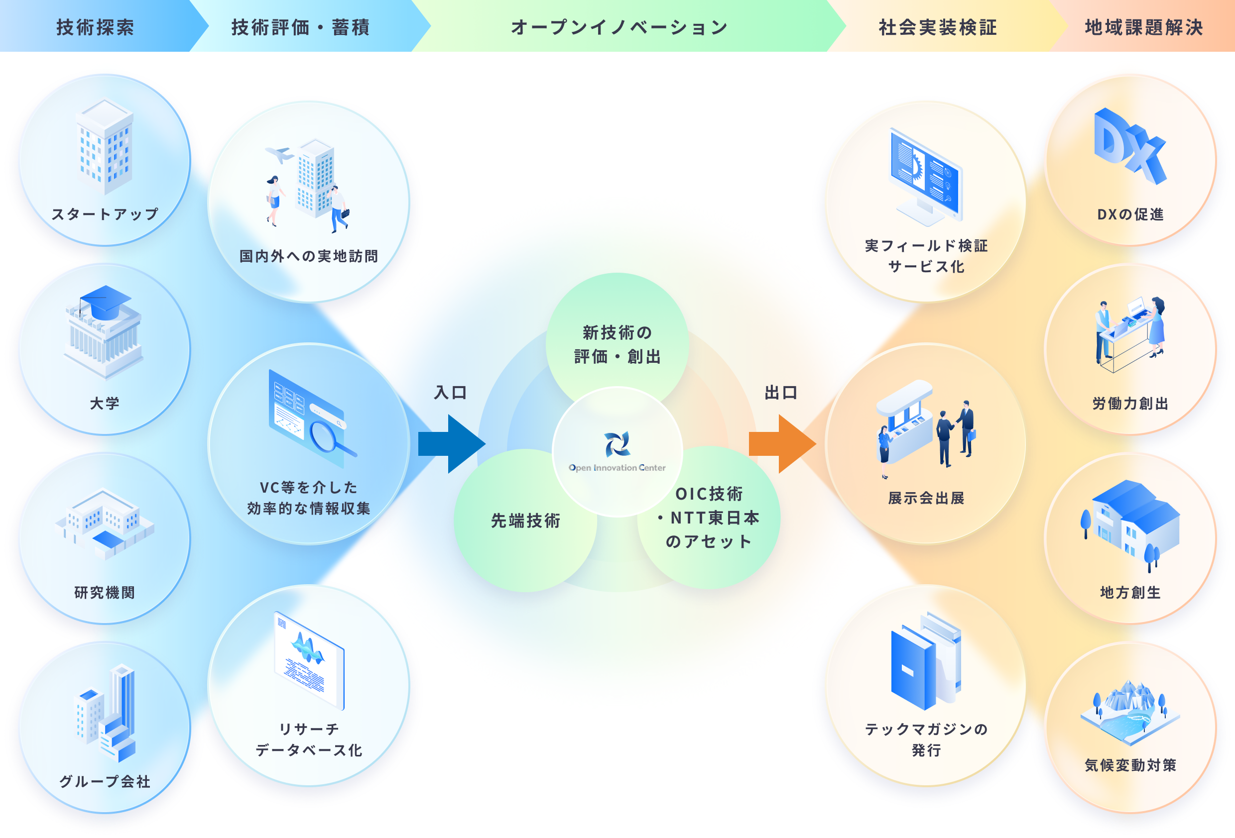 取り込んだ先端技術と、OIC独自の技術、NTT東日本のアセットを掛け合わせることで、新たな技術開発と検証を進めています。単なる技術導入にとどまらず、差異化につながるプロダクトや技術へと磨き上げていきます。