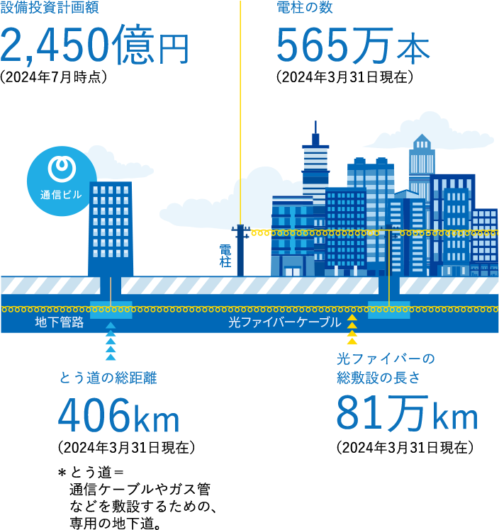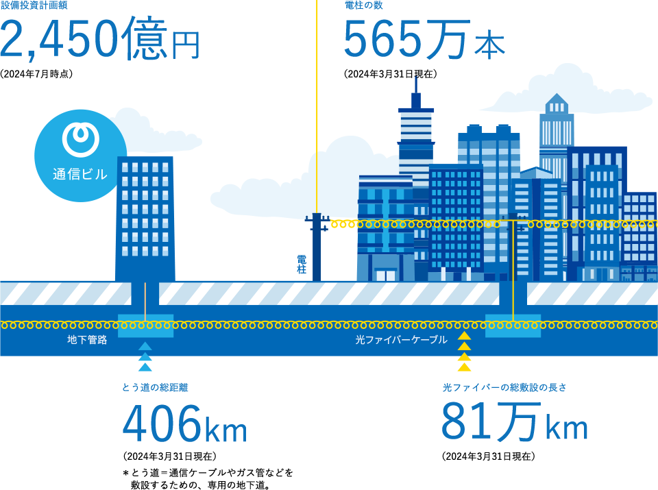 設備投資計画額 2,450億円(2023年7月時点)/電柱の数 565万本(2023年3月31日時点)/とう道の総距離 406km(2023年3月31日時点)*とう道=通信ケーブルやガス管などを敷設するための、専用の地下道。/光ファイバーの総敷設の長さ 80万km(2023年3月31日時点)