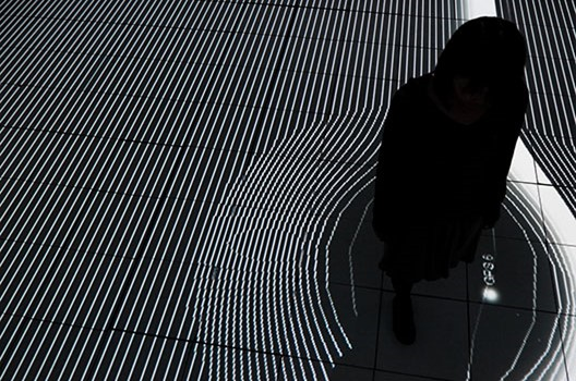 複数の人が自由に歩き回ることで起こる変化が、リアルタイムで画像・音・光へと変換され、相互に関係しながら空間全体が大きく変容していく体験型のインスタレーションです。