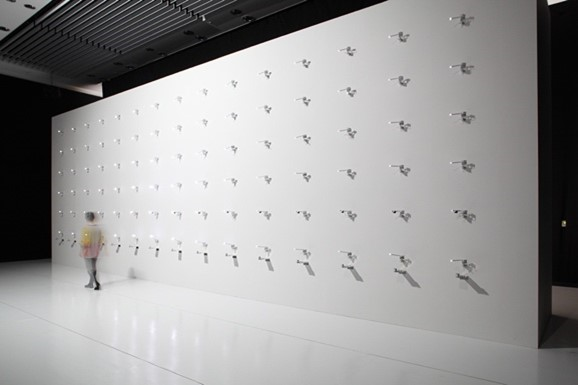 「蠢く壁面」「多視点を持った触覚的サーチアーム」「巡視する複眼スクリーン」と名づけられた3つの要素から構成される、大型インタラクティブ・インスタレーションです。センサーと小型カメラを搭載した90個の装置が一面に設置された壁面(「蠢く壁面」)と、展示室中央の天井から吊られた、カメラとプロジェクターを搭載した6基のロボット・アーム(「多視点を持った触覚的サーチアーム」)の各装置は、昆虫がうごめくように観客の位置や動きを察知し、それに向かって動き出し、観客を監視します。