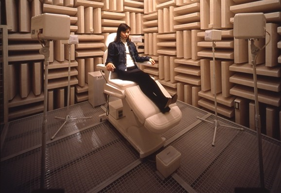 ICCが1997年4月に開館した際、常設展示として10作品が委嘱制作され、ICCコレクションとなりました。そのひとつである《存在、皮膜、分断された身体》(1997)は、身体器官の音を空間内に拡張・変容させていく「知覚による建築」を提示する作品です。無響室という音の反響のない特殊な空間で、身体の奥から発生する自身の体内音とスピーカーから流れてくるリアルタイムに増幅された体内音の二つの音のズレが、身体と思考を分離し、肉体としての身体感覚が消滅して断片化された諸感覚が覚醒していきます。ちなみに、現在もサウンド・アート作品の展示に活用されているICCの無響室は、本作品を展示するために設置されたものです。