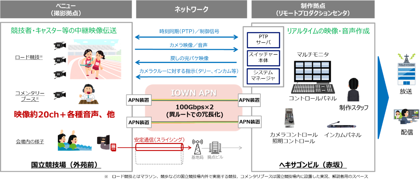 NTT株式会社(本社:東京都千代田区、代表取締役社長:島田 明、以下「NTT」)とNTTドコモビジネス株式会社(旧 NTTコミュニケーションズ株式会社、本社:東京都千代田区、代表取締役社長:小島 克重、以下「NTTドコモビジネス」)、NTT東日本株式会社(本社:東京都新宿区、代表取締役社長:澁谷 直樹、以下「NTT東日本」)は、映像・音声プロダクションの効率化と高度化を目的として、リモートプロダクションの地上波生放送中継番組における活用(以下、本取り組み)に成功しました。本取り組みでは、TBSテレビとNTTドコモビジネスが新規に構築したリモートプロダクションセンター※1と撮影現場である国立競技場をIOWNオールフォトニクス・ネットワーク(以下、「IOWN APN」)※2※3で接続することで、制作拠点にとらわれない柔軟な設備環境を実現しました。