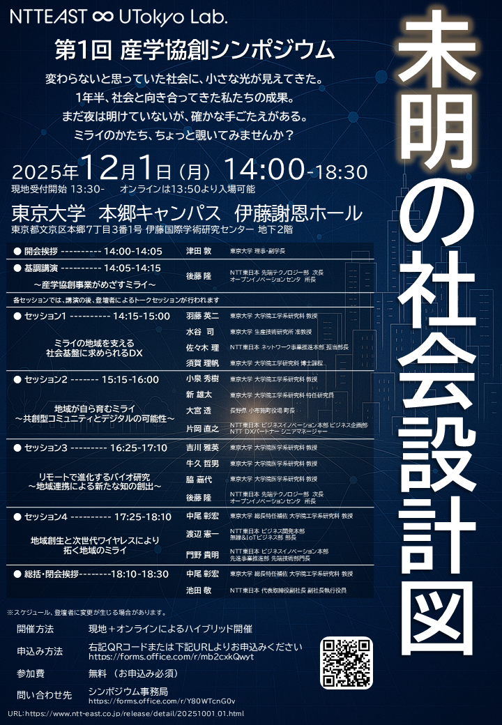 国立大学法人 東京大学(総長:藤井 輝夫、以下「東京大学」)とNTT東日本株式会社(代表取締役社長:澁谷 直樹、以下「NTT東日本」)は、2024年4月17日付で産学協創協定を締結しました。この協定に基づき設立された「NTT東日本東大ラボ」では、地域循環型社会の実現に向けた共創プロジェクトを推進しており、その成果と今後の展望を広く共有する場として、「第1回産学協創シンポジウム」を開催します。