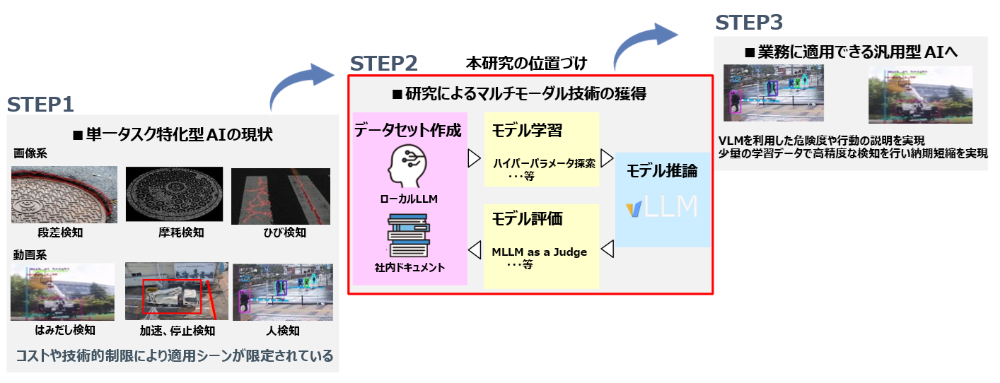 本研究では、画像とテキストの両方を理解できるVLMを活用し、これまで困難だった現場の状況説明や作業指示の自動生成を可能にすることで、安全確認の精度向上を高め、業務プロセスの高度化を図ります。さらに、作業時間の短縮や確認精度の向上により、安全管理業務の効率を従来比で約30%向上させることをめざします。