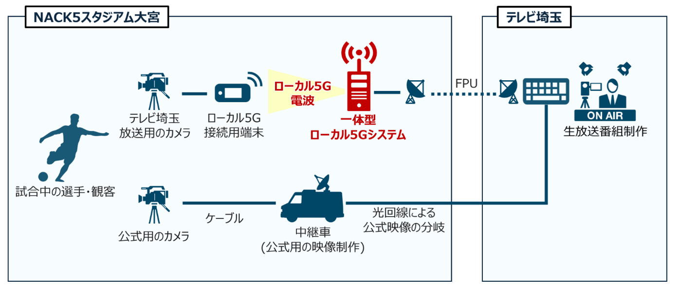 NTT株式会社(以下、NTT)、NTT東日本株式会社(以下、NTT東日本)は、株式会社テレビ埼玉(以下、テレビ埼玉)と、公益社団法人日本プロサッカーリーグ(以下、Jリーグ)協力の元、2025年11月23日(日)にNACK5スタジアム大宮で開催された、「明治安田J2リーグ 第37節 RB大宮アルディージャ vs 徳島ヴォルティス」において、ローカル5Gを活用した高画質・低遅延で安定的な映像伝送によるTV生中継の実証実験を実施し、放送事業者における映像制作現場へのローカル5Gの実用性を確認しました。