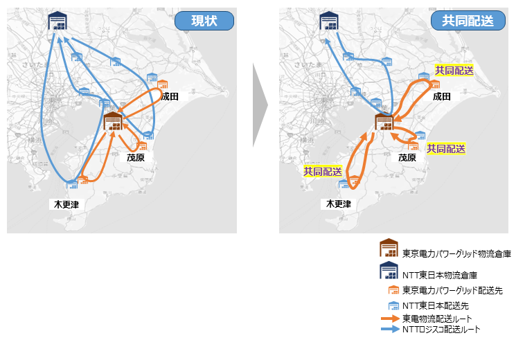 本取り組みにおける輸配送業務については、NTT東日本の輸配送を株式会社NTTロジスコ、東京電力PGの輸配送を東電物流株式会社にそれぞれ委託し、両社が連携して共同配送を実施します。