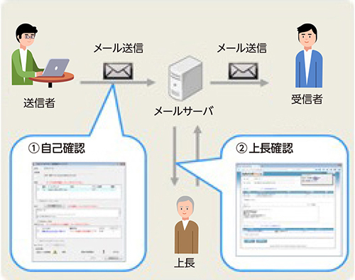 また、お客さま情報等を誤って社外へ流出させることを防止するため、メールを送信する際に送信ボタンを押すと 「送信先」「メール本文の内容」「添付ファイルの内容」に誤りがないかを自ら確認する機能や、社外宛のメールにファイルを添付して送信する場合は、クラウドストレージを利用したファイル授受に加え、管理者の承認を必要とするしくみを導入しています。
