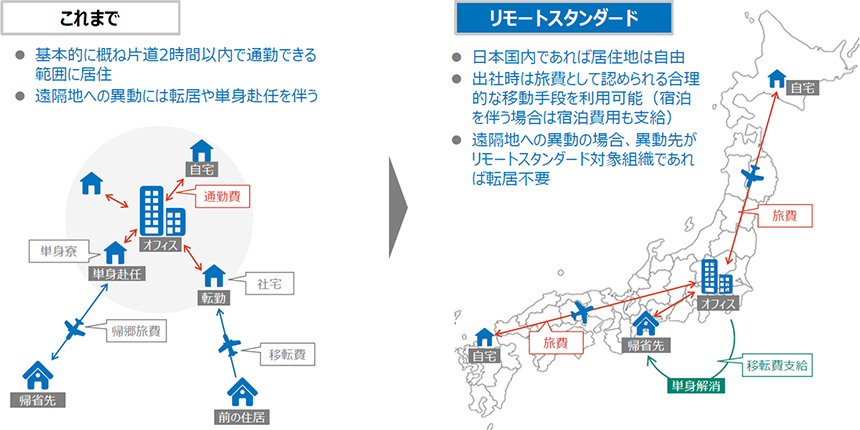 出社による「直接対面」と「リモート」のそれぞれの良さを組み合わせた働き方「ハイブリッドワーク」を推進し、居住地に縛られない人事異動の実現、および社員のWell-Being推進、組織としての生産性や創造性の向上をめざします。